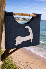 This navy beaded purse featuring the iconic Cape Cod silhouette captures the charm and relaxed sophistication of coastal living. Hand-beaded in rich navy with a crisp white Cape Cod design, the bag brings texture, artistry, and timeless style together in one beautifully crafted piece.